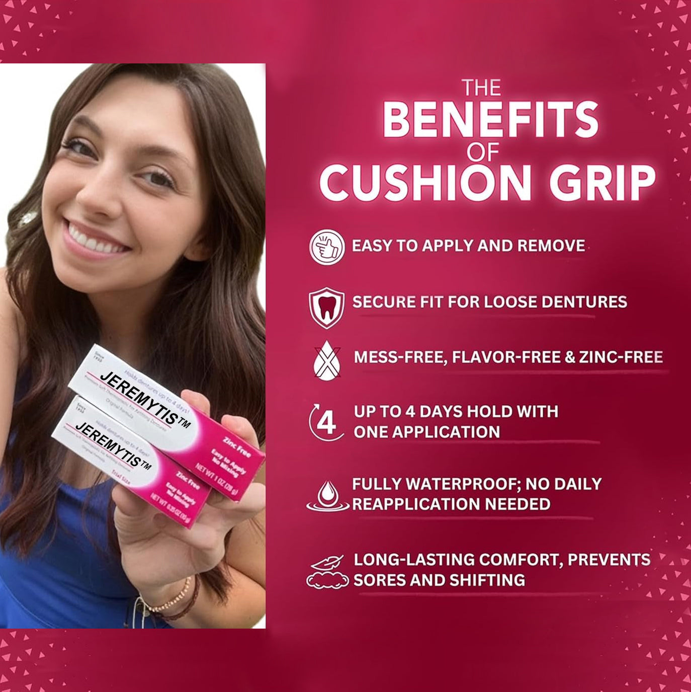 "JEREMYTIS™ has truly transformed my daily life! Now I can enjoy my meals and smile all day without denture pain."--Lily Hall