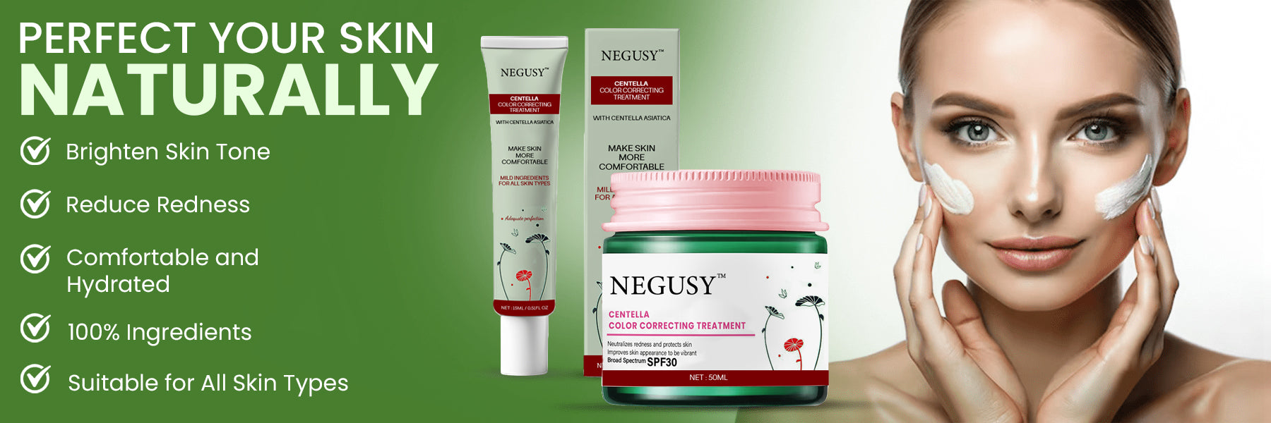 Negusy™ Centella Correcting Treatment is a multi-functional skincare product designed to balance skin tone, conceal redness, and reduce the appearance of dark spots while providing hydration and nourishment for a healthy, radiant complexion.