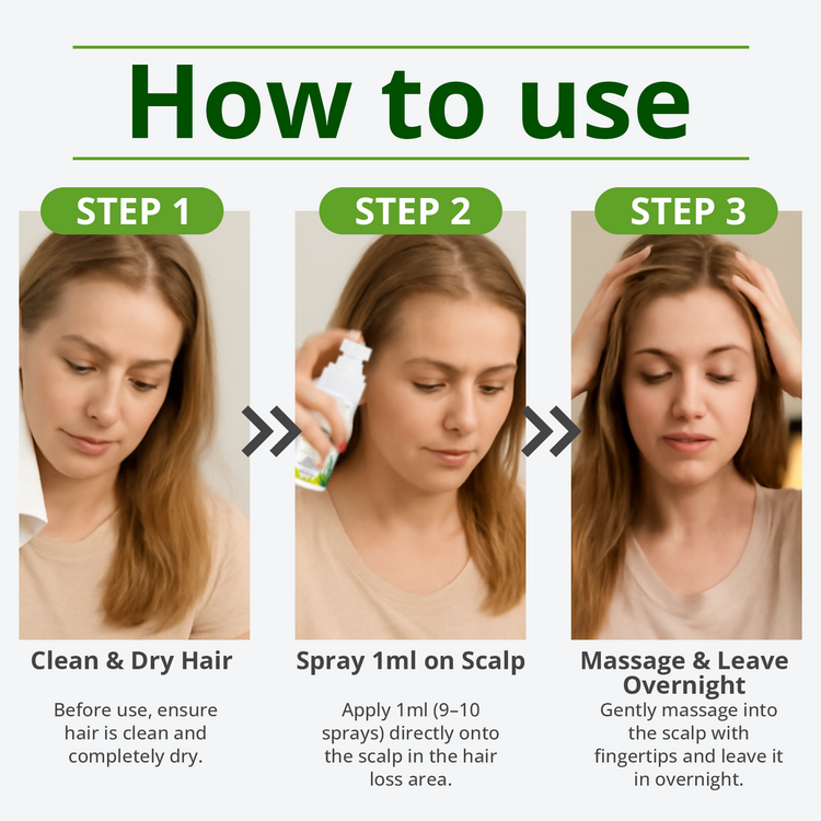 Step2: Apply 1ml (9-10sprays) directly onto the scalp in the hair loss area.