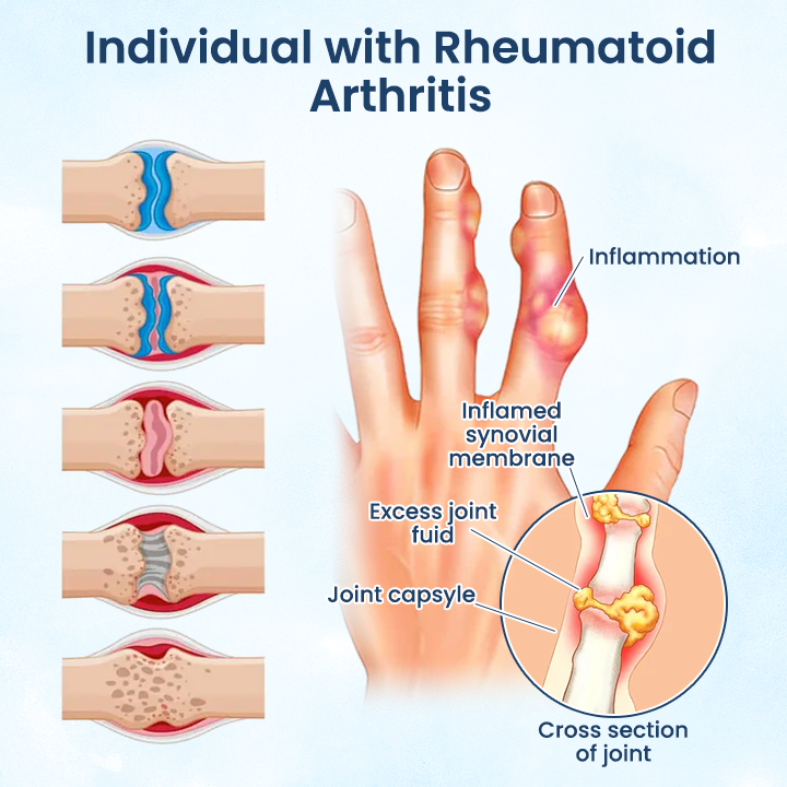 A chronic inflammatory autoimmune disease where the immune system attacks the synovial lining of the joints, causing pain, swelling, and stiffness. RA typically affects smaller joints such as the fingers, wrists, knees, and ankles, but can also impact larger joints.