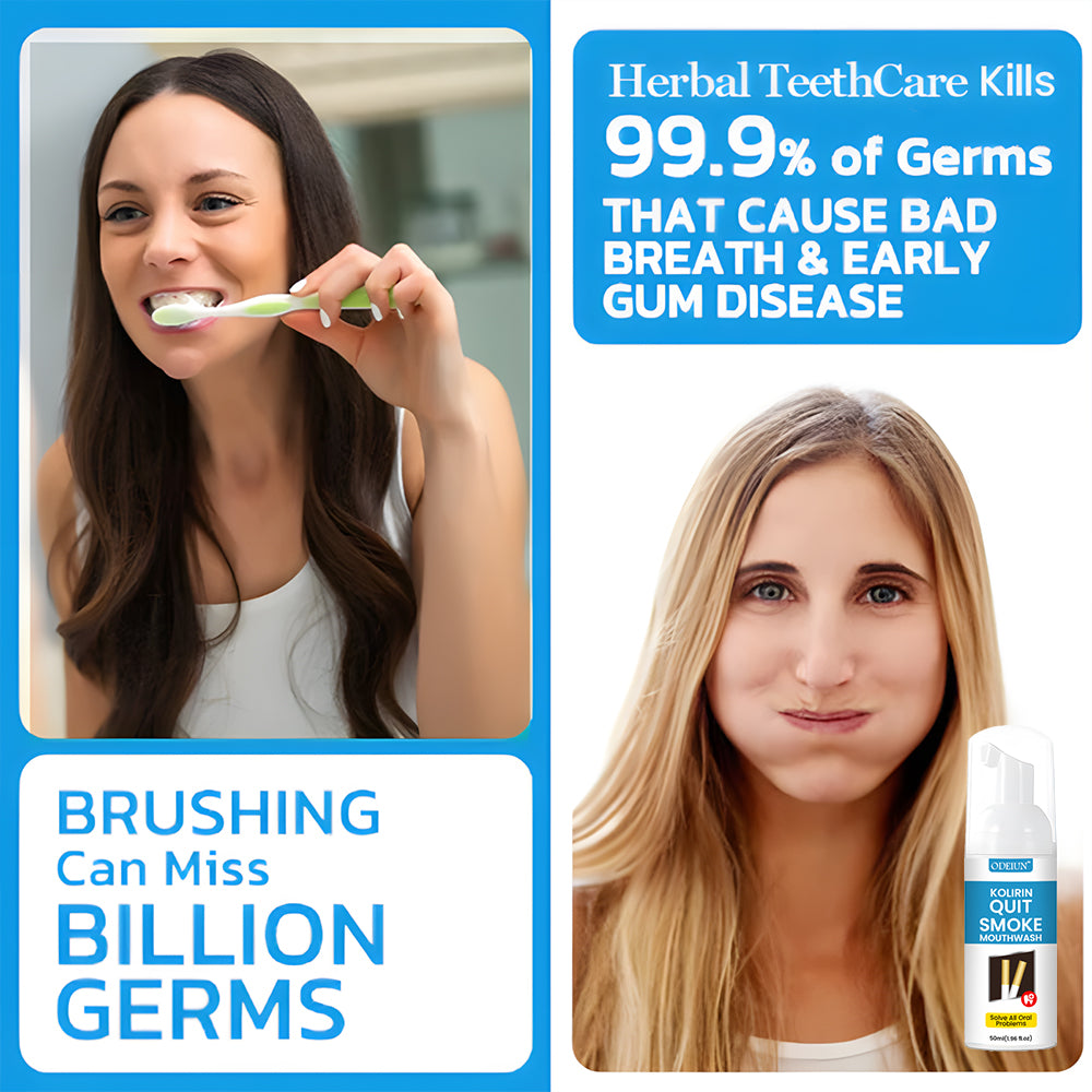 Odeiun⢠Kolirin QuitSmoke Mouthwash is the latest product certified by the American Dental Association and recommended by dentists. It can perfectly solve all oral problems, including dental calculus, bad breath, oral ulcers, dental caries, bleeding gums, tooth sensitivity, gingivitis, loose teeth, periodontitis, swollen gums, tooth damage, tooth loss, etc. No side effects. Made from 100% natural herbs. Suitable for everyone, including children, young people, and the elderly.