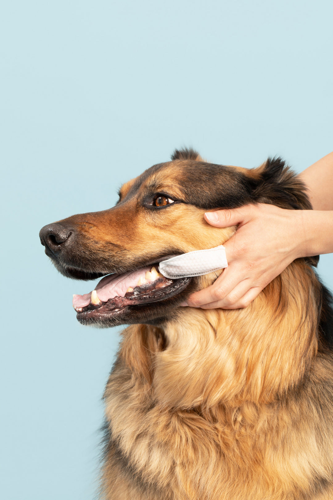 Place the finger wipe onto your index finger and softly massage the teeth and gums in a circular motion. Use a new wipe for both the top and bottom of the mouth. For optimal outcomes, incorporate this routine into your pets daily oral hygiene to uphold cleanliness and ensure fresh breath.