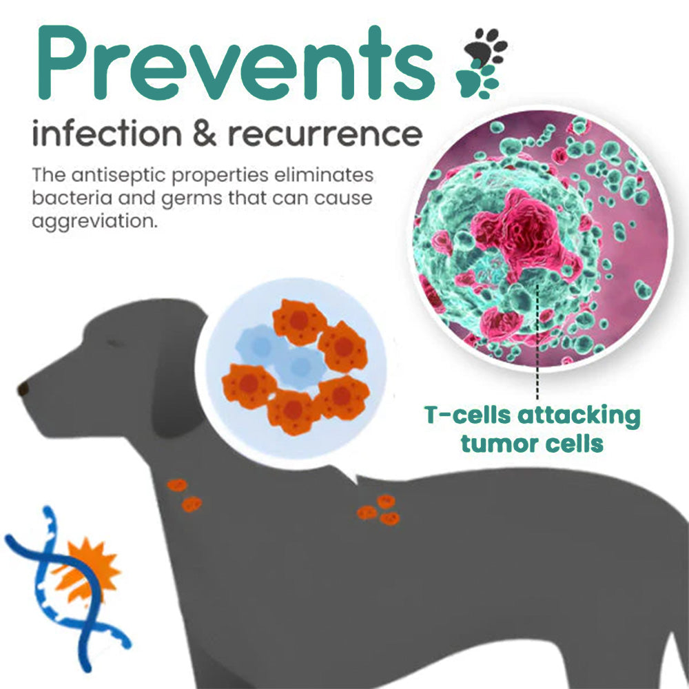 With its antiseptic properties, Odeiun⢠protects against infections and maintains your pet's skin health. This helps prevent complications from untreated skin issues. Tea Tree Oil and Calendula specifically target infections related to lumps and bumps. Tea Tree Oil combats bacteria and fungi, while Calendula supports skin health and cleanliness, ensuring the affected areas stay free from harmful pathogens.