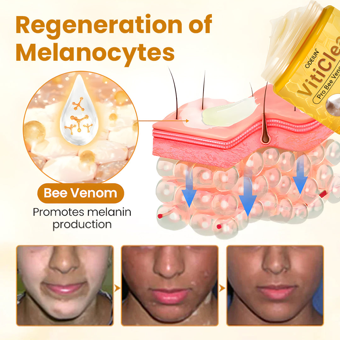 ODEIUN™ VitiClear Pro Bee Venom Cream is enriched with high-activity PLA2 to help suppress this abnormal immune response, protect melanocytes, and gradually restore natural skin tone.