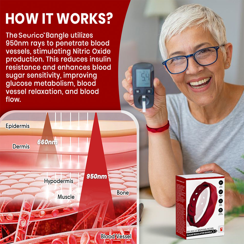 Unlike other far infrared products that operate at 600nm and mainly impact the skin surface, the Seurico™ HypoGlycod Bracelet uses rays at 850nm that penetrate deep into blood vessels. This stimulates the production of Nitric Oxide, which helps reduce insulin resistance and enhance blood sugar sensitivity. As a result, users benefit from improved glucose metabolism, relaxed blood vessels, and better blood circulation. Simply wearing the bracelet can help lower blood sugar levels with ease.